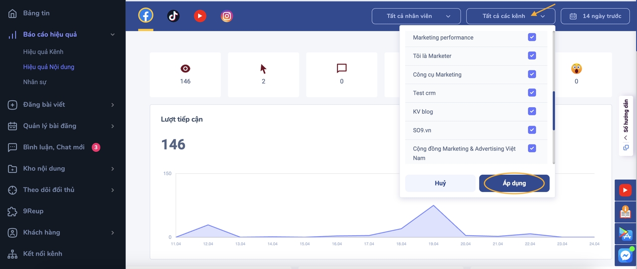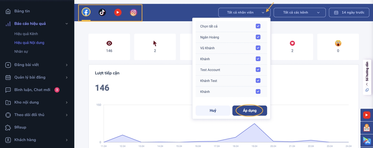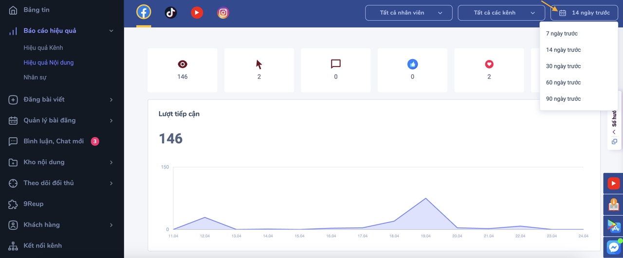 Hệ thống báo cáo hiệu quả nội dung của SO9 cung cấp cho bạn thông tin chi tiết về hiệu suất của các bài đăng, video, ảnh và reel trên các trang mạng xã hội của bạn. Nhờ vậy, bạn có thể đánh giá nội dung nào thu hút người xem, tối ưu hóa chiến lược nội dung và tăng hiệu quả hoạt động mạng xã hội của mình. Tại trang màn hình báo cáo hiệu quả nội dung, bạn có tuỳ chọn bất kì nền tảng mạng xã hội nào để theo dõi. Tại đây, bạn có thể chọn nhân viên, chọn kênh và thời gian bạn muốn theo dõi.