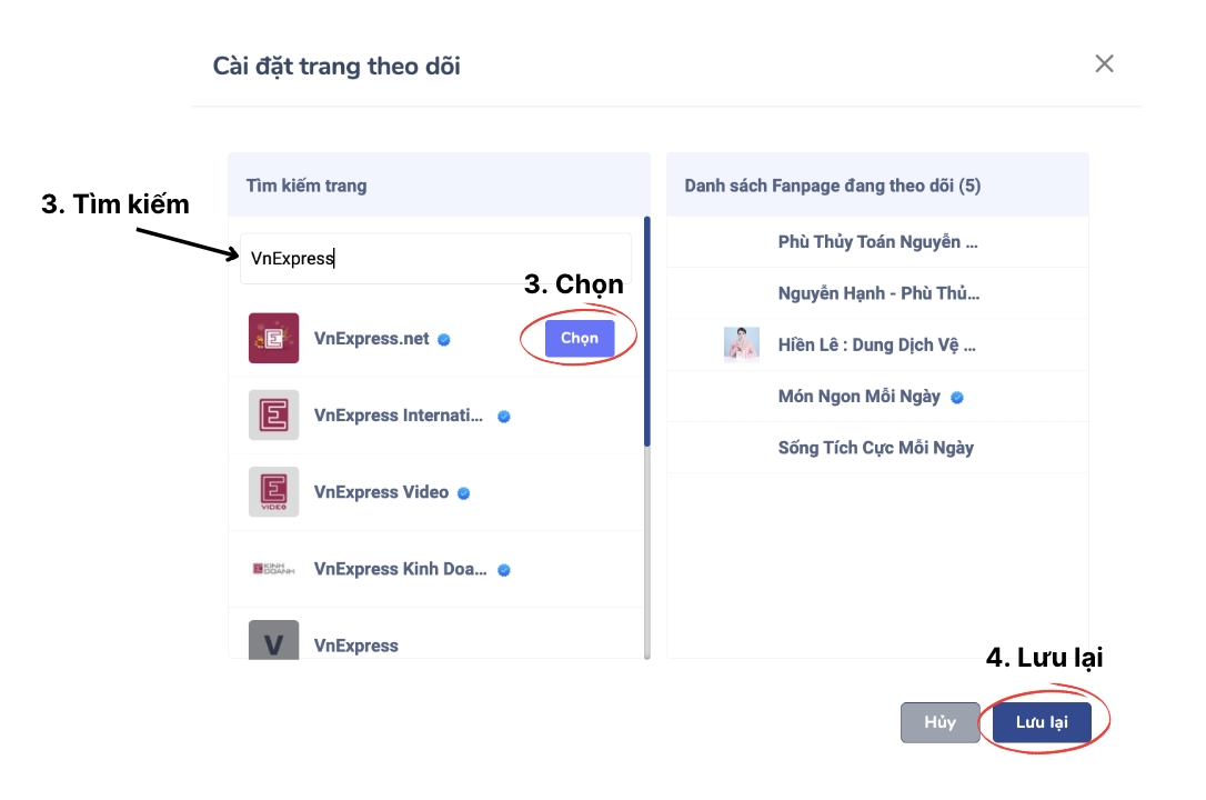 Bước 3: Tìm kiếm tên Fanpage bạn muốn theo dõi và ấn “Chọn”