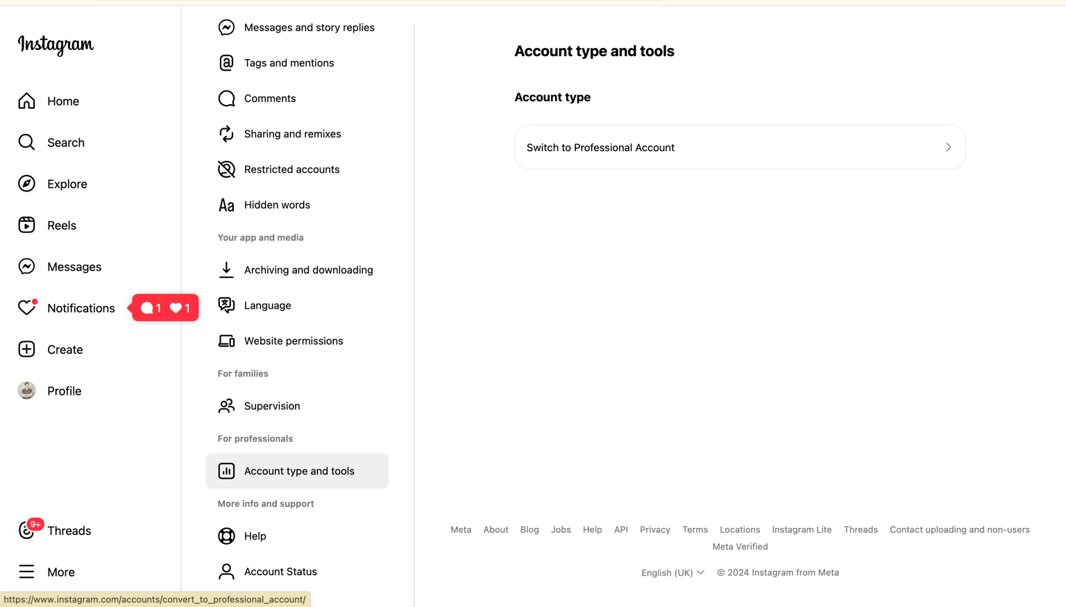 <mark style="color:orange;">**Step 1:**</mark> Go to *Settings* and click on *Switch to Professional Account.*
