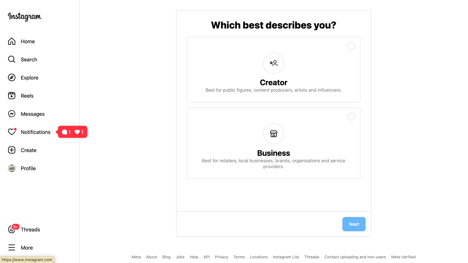 <mark style="color:orange;">**Step 2:**</mark> Choose *Business Account* or *Creator Account* and click *Continue*.